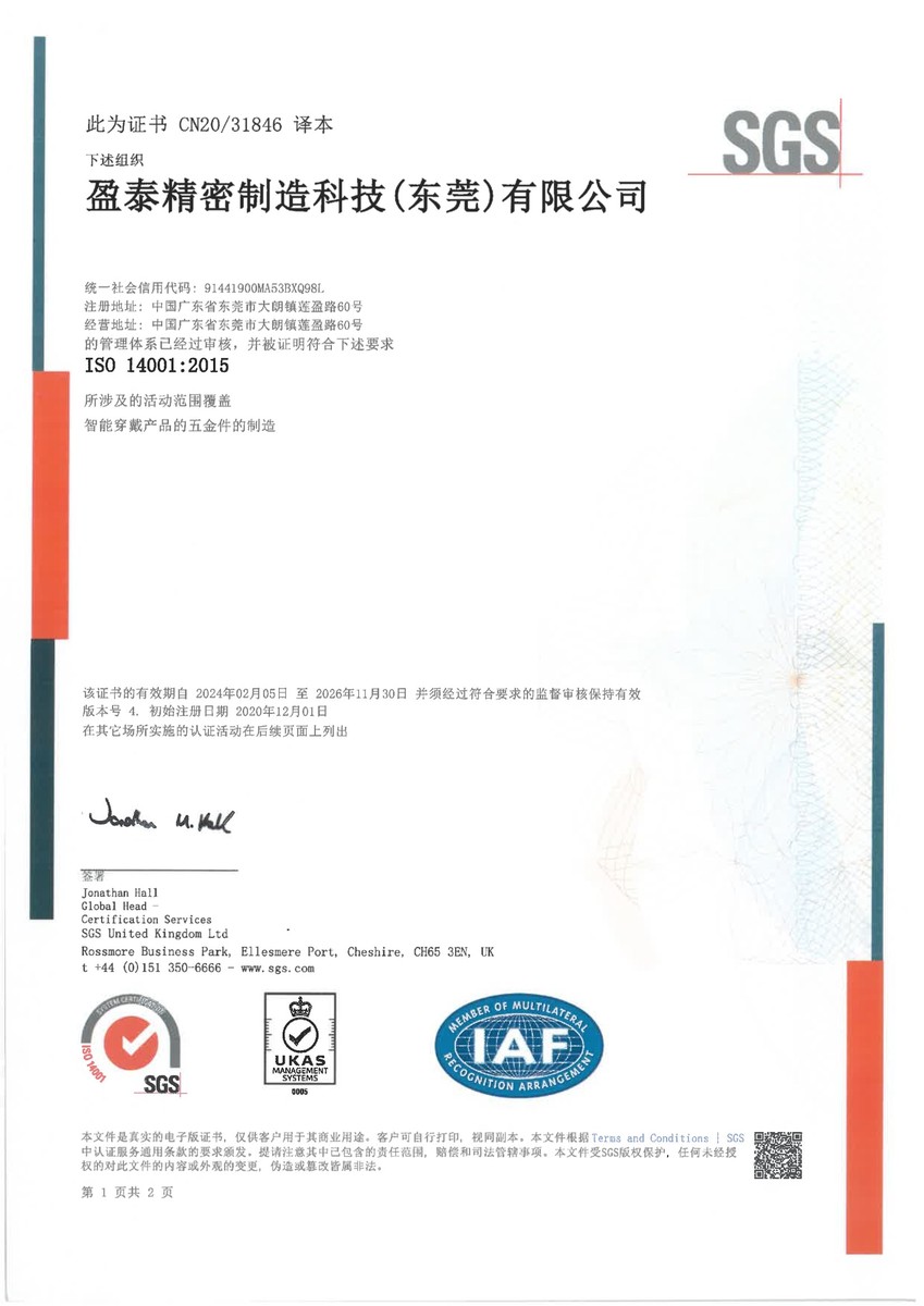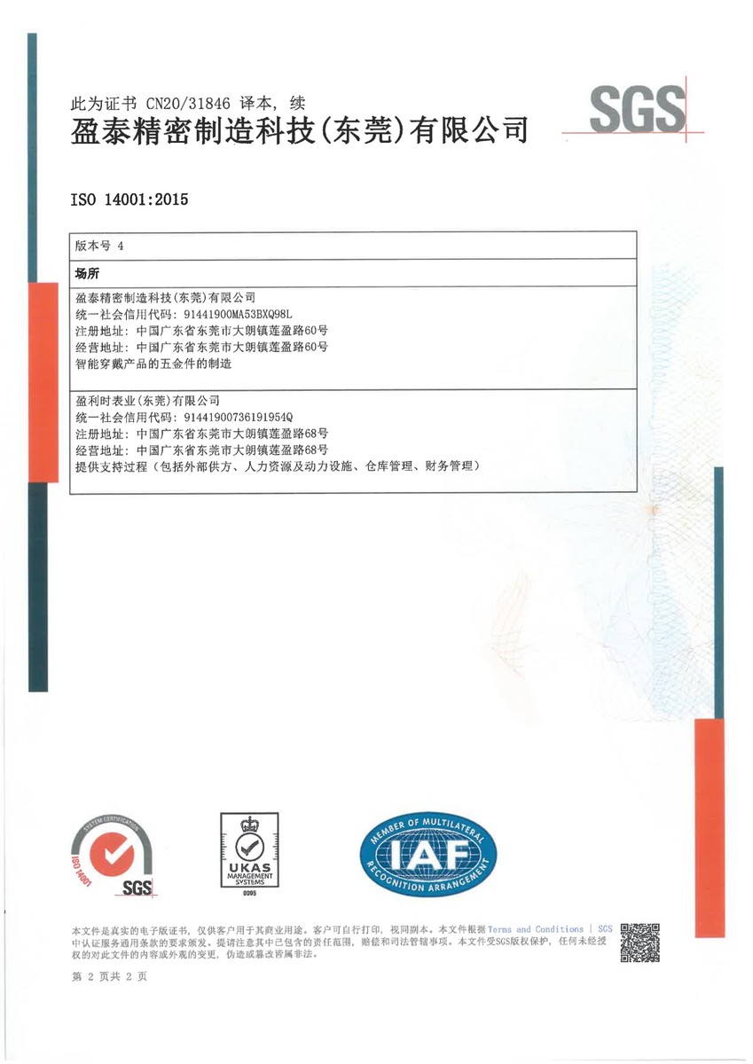 | ● 2020年12月 | 大朗盈利時及盈泰廠取得ISO 14001:2015環境管理體系認證證書; |