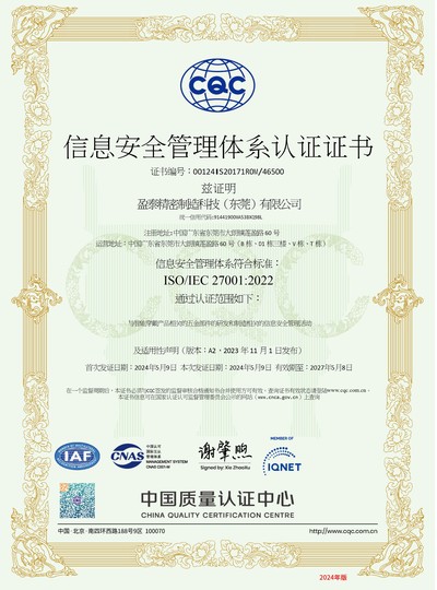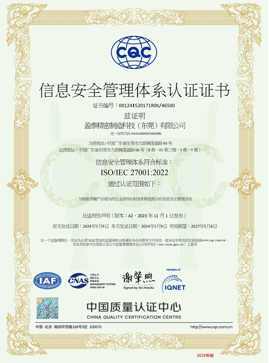 | ● 2024年5月 | 大朗盈泰廠取得ISO/IEC 27001:2022信息安全管理體系認證證書; |