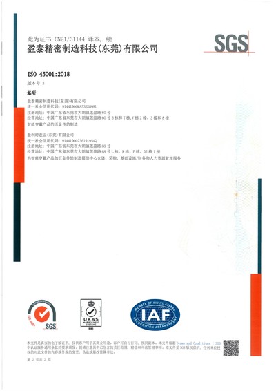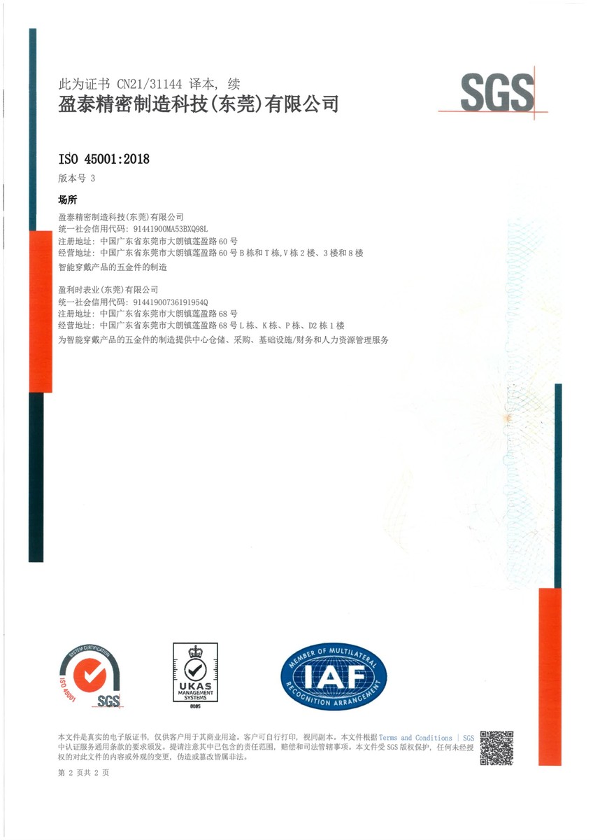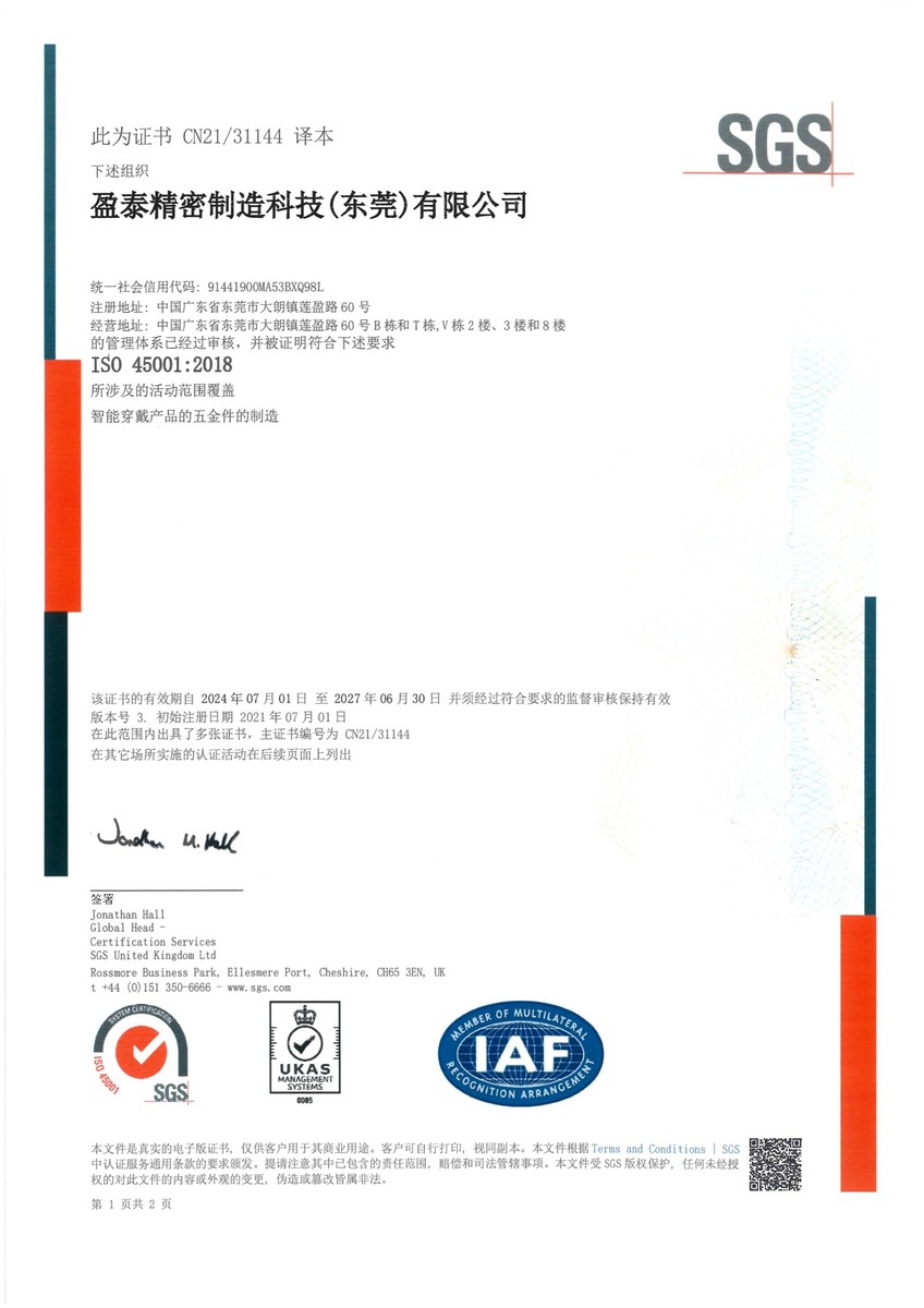 | ● 2021年7月 | 大朗盈泰廠取得ISO 45001:2018職業健康安全管理體系認證證書; |