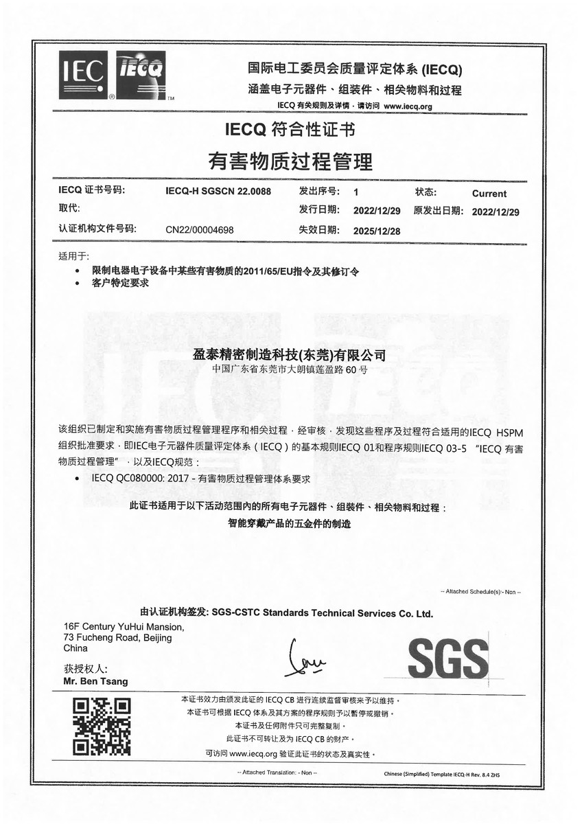 | ● 2022年12月 | 大朗盈泰廠取得IECQ QC080000:2017 有害物質過程管理體系認證證書; |