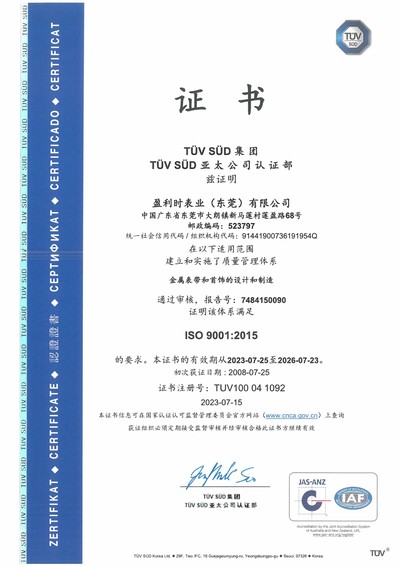 | ● 2008年7月 | 大朗盈利時廠取得ISO 9001:2000品質管理系統認證證書; |